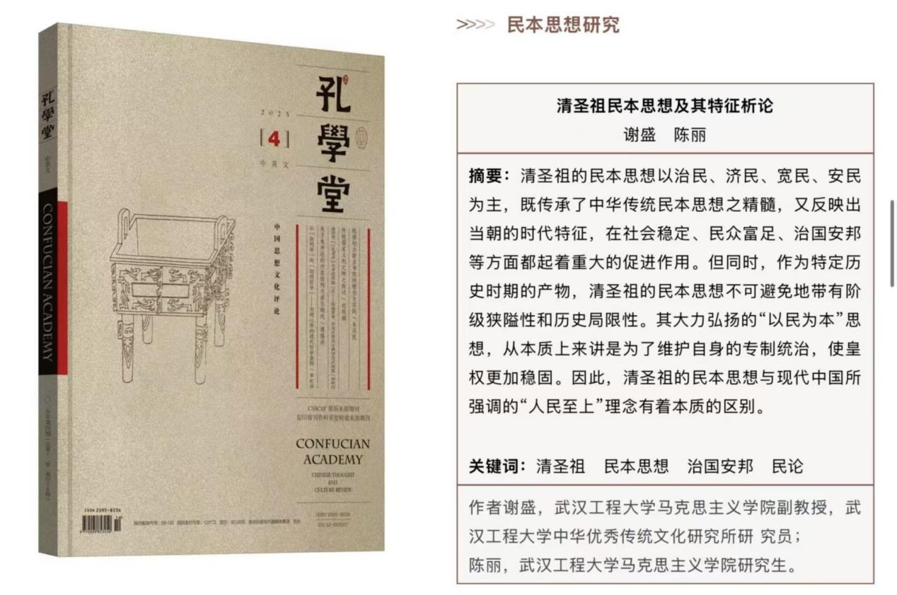 本网讯(通讯员 张晓 宋嘉怡)近日,我院谢盛副教授、硕士研究生陈丽在《孔学堂》(CSSCI扩展版期刊)发表论文《清圣祖民本思想及其特征析论》。