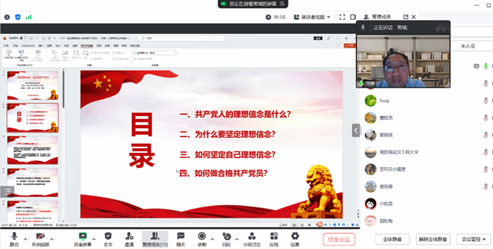 最后,“原理”党支部书记李齐同志做总结讲话指出,感谢常城副院长为“原理”党支部党员教师上了一次既具有知识性、又具有价值性的专题党课,用高度概括的语言围绕理想信念阐发了自己对如何做合格共产党员的全面且深入的思考。李齐同志提出,全体支部党员教师要以此次主题教育专题微党课为契机,不断深入学习贯彻落实习近平新时代中国特色社会主义思想,积极落实学院党委的工作要求,要把开展主题教育活动及其收获作为教学科研工作的指导,把干事创业与自身发展充分结合,践行共产党员的优良品质。(审稿人 曹胜亮)