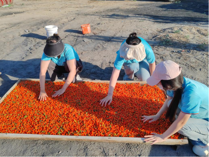采摘结束后,实践队员们并未停下脚步休息,而是迅速转换角色,成为晾晒枸杞的得力助手。在杞农的悉心指导下,她们学习了枸杞晾晒的传统技艺,从挑选合适的晾晒场地到均匀摊开枸杞,再到定时翻动以确保每一面都能充分晒干,每一个步骤都认真参与,确保每一颗枸杞都能得到妥善处理,保持其最佳品质。实践队员们深知,晾晒是枸杞生产过程中至关重要的一环,它直接关系到枸杞的保存品质和市场价值。她们对待这一工作丝毫不敢懈怠,全身心地投入到晾晒工作中。在烈日的炙烤下,队员与杞农们一起,用勤劳的双手共同铺就了一条通往丰收的金色大道。