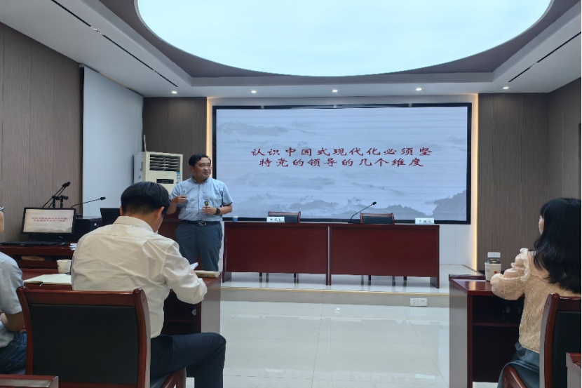 (通讯员:熊凡 王芸歌)9月12日下午,华中师范大学政治与国际关系学院副院长、博士生导师王建国教授应邀作客我院第83期求是论坛,并作题为“认识中国式现代化必须坚持党的领导的几个维度”的学术报告。本次报告会由学院院长曹胜亮教授主持,学院全体教师及2023级、2024级研究生参加本次讲座。