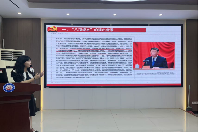 在活动过程中,研究生第二党支部李娟同志以“共筑边疆梦”为主题,带领学习习近平总书记给谢依特小学戍边支教西部计划志愿者服务队队员的回信,让我们真切感受到中华民族大家庭的温暖与力量。教工第一党支部董苾茜同志讲授微党课《深刻领悟中央八项规定和中央八项规定精神的丰富内涵》,董苾茜同志提出,我们既要通过理论学习筑牢思想防线,更要在实践中锤炼自律品格。教工第二党支部胡秋梅同志讲授微党课《深入学习贯彻中央八项规定精神,不断加强新时代党的作风建设》。胡秋梅同志指出,中央八项规定,是全面从严治党的关键制度,充分彰显了党的自我革命精神。中央八项规定从细微处入手,直击作风问题核心,展现出党自我革新的坚定决心,是党员干部的行为准则,也是我们青年学子的行动指引。