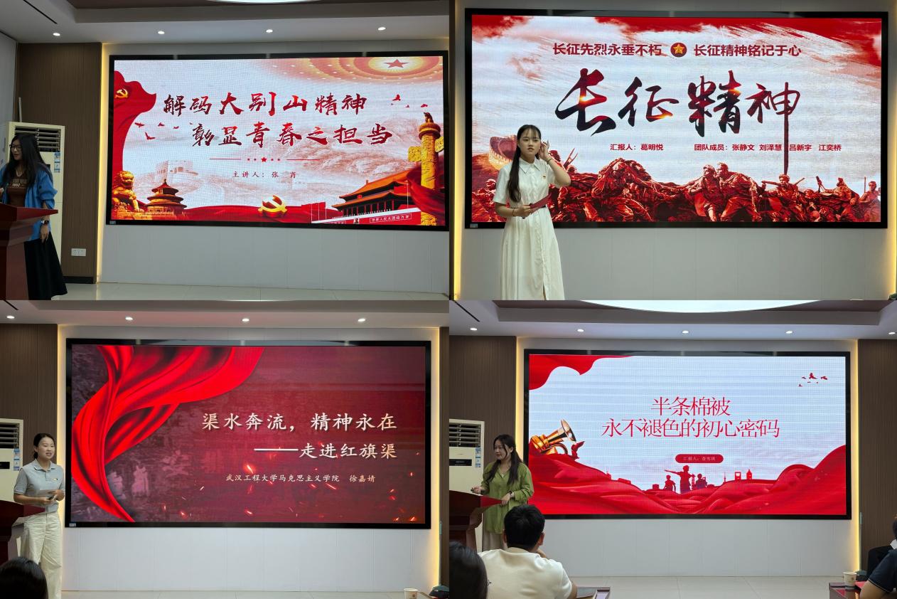 张肖团队阐述了大别山精神的丰富内涵,强调其是共产党人和人民群众在革命斗争中铸就的宝贵精神财富。葛明悦的微党课围绕长征展开,号召马院学生讲好长征故事。徐嘉婧讲述了红旗渠修建的背景、过程、成功原因及精神内涵,激励当代青年传承这些品质。查雪琪主要陈述了“半条棉被”的故事,激励新时代党员干部在各方面践行初心使命,继续奋斗。
