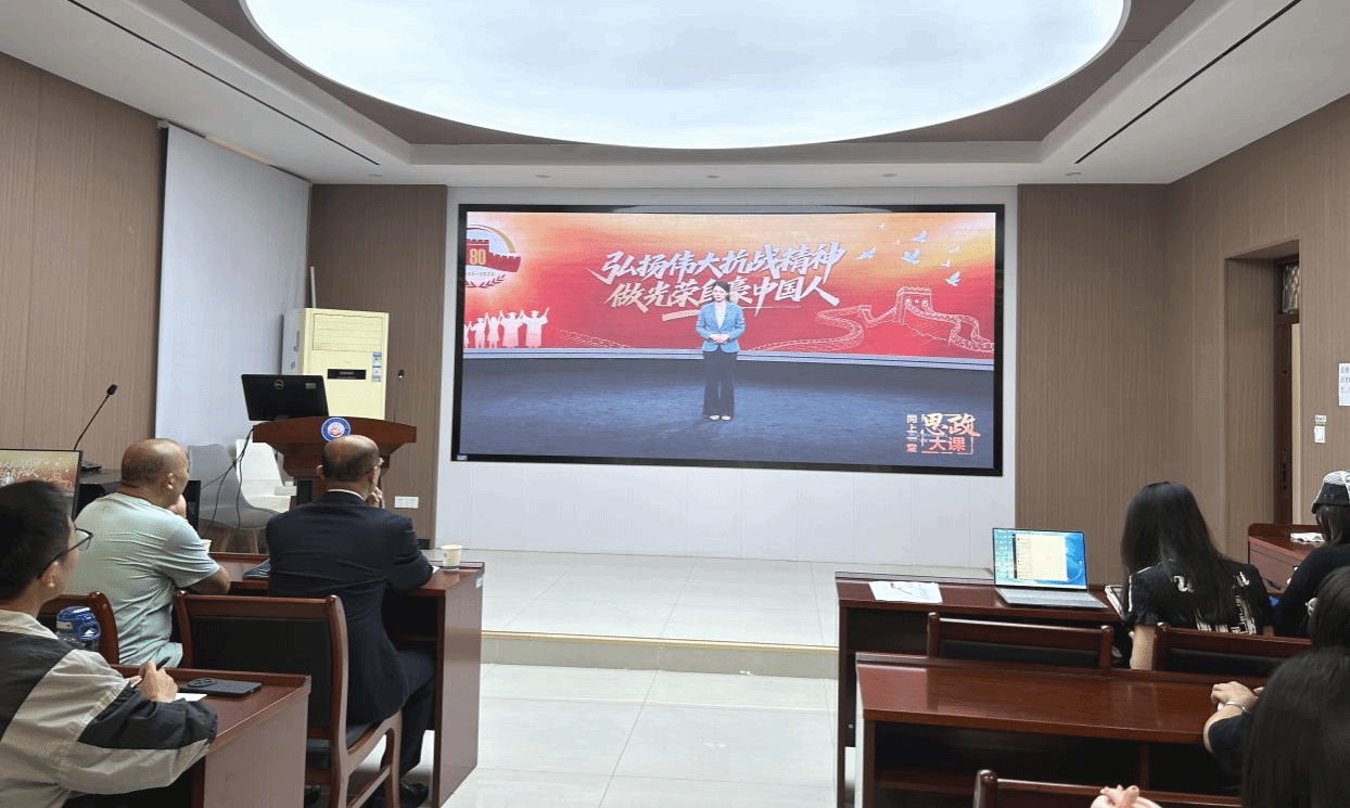 默哀结束后,学院组织全体研究生同步收看由教育部、中央网信办、人民日报社、国家文物局主办、人民网协办的“全国大中小学生同上一堂思政大课”大学篇“大国担当”直播。直播中,专家学者围绕纪念中国人民抗日战争暨世界反法西斯战争胜利 80 周年展开论述,从历史纵深出发,结合新时代中国在国际舞台上的责任与担当,生动阐释了伟大抗战精神的时代内涵,让在场研究生深刻理解了“大国担当”的重量,进一步激发了大家的民族自豪感与使命感。