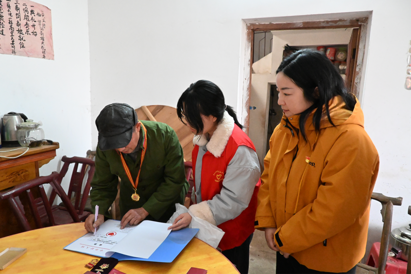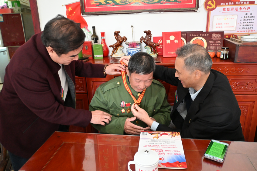下午,慰问组来到浠水县清泉镇洪冲村参战老兵裴加祥家中。得知老人曾在对越自卫反击战中荣立三等功,如今身患严重肺病、高血压,妻子与儿子也常年受病痛困扰、家庭经济拮据,慰问组成员紧握老人双手,详细询问其治疗情况与生活需求,为他送上慰问金与诚挚关怀。谈及当年参战经历,裴加祥老人眼中闪烁着坚毅的光芒,轻声却有力地“能为国家出力,我从不后悔。”