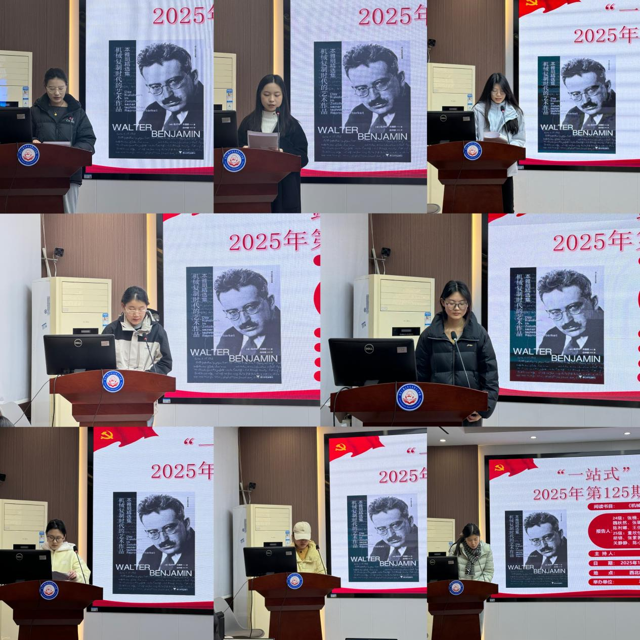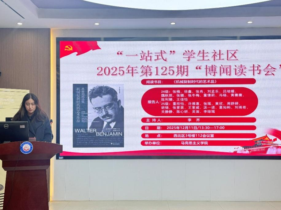 本网讯(通讯员 张琪 张艺璇)2025年12月11号下午,我院“一站式”社区第125期“博闻读书会”在2138cn太阳集团求是楼112会议室顺利召开。本次读书会以“机械复制技术对艺术本质、功能及社会价值的变革”为主题,围绕着瓦尔特·本雅明的著作《机械复制时代的艺术品》展开讨论。本次读书会由李齐老师主持。参加此次读书会的27位研究生主讲人分别为2024级刘孟乐、吕培媛、魏秋然、张璐、张冬梅、董倩莉、冯杨、徐鑫、黄薇薇、陈利娜、张楠、张肖以及2025级董欣怡、许雅慧、张瑶、黄欣、周舒婷、胡锦、张紫茵、王紫威、汲一诺、葛知屿、刘雨希、关静静、李琼瑶、陈心妍、吴苗。院“博闻读书会”学术活动工作小组组织了此次读书会。