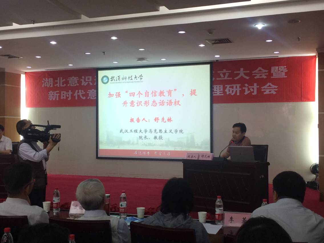 我院舒先林教授在大会上受聘为湖北意识形态建设研究院咨询专家,并作了题为《加强“四个自信”教育,提升意识形态话语权》的专题报告。报告认为:思政课教师是高校意识形态建设的主力军,在教育教学过程中,一定要树立责任意识、阵地意识和问题意识;高校主流意识形态内涵建设应围绕“四个自信”展开,思政课教育教学必须增强大学生对“四个自信”的理解和认同;“四个自信”背后的逻辑实际上是“价值自信”,要通过加强“四个自信”教育推进马克思主义中国化时代化大众化,提升国际话语权。