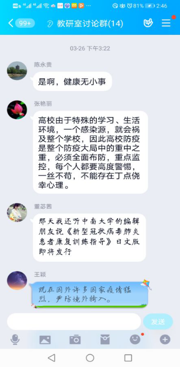“原理”教研室通过个人自学和在线集中交流相结合的形式进行了学习,在2020年3月26日下午,“原理”教研室以在线集中交流的形式进行了新型肺炎防控知识的学习。“原理”教研室负责人领学了《手册》、《指南》的纲目和重点,教研室其他成员在QQ群自由发言,讨论了预防新型肺炎的学习心得。