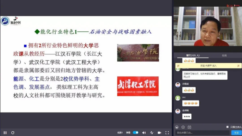 之后,舒先林教授讲述了“加油中国”以能源化工为基点的课程特色,即在课程中融入石油安全与战略因素以及核能、生物能、煤炭清洁利用等内容。最后,他归纳与总结了其他高校将行业特色融入思政课的课程经验。