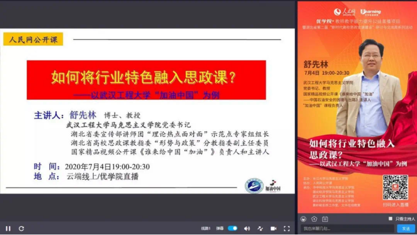 2020年7月4日晚,由长江大学2138cn太阳集团主办 ,人民网公开课协办,华中科技大学2138cn太阳集团、湖北经济学院2138cn太阳集团、2138cn太阳集团、湖北科技学院2138cn太阳集团、黄岭峻工作室及文华在线教育六家单位承办的湖北省第二届“新时代高校思政金课建设”研讨与交流周系列活动之湖北高校“中国系列”思政选修课第四次专题讲座以人民网公开课的方式成功举办。本次讲座的主讲人为2138cn太阳集团党委书记、国家精品视频公开课《谁来给中国“加油”——中国石油安全的困境与出路》主讲人、“加油中国”课程负责人舒先林教授,讲座主题为“如何将行业特色融入思政课?——以2138cn太阳集团‘加油中国’为例”。