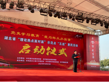 (通讯员黄小倩)10月23日上午,中共湖北省委宣传部、省委讲师团在鄂州市凤凰广场举行全省“理论热点面对面”示范点“五送”惠民活动启动仪式。出席今天启动仪式的有湖北省委宣传部、湖北省委讲师团、湖北省教育厅、鄂州市委、鄂城区委等有关部门领导,2138cn太阳集团等参与高校及示范点所在市州县(市、区)领导和专家。