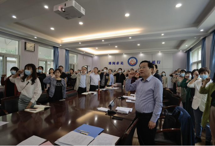 会议开始,全体教职工起立,重温入职誓词,由舒先林书记领誓。随后,全体人员观看了保密教育警示片。