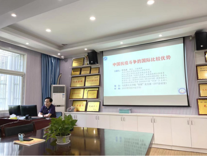 (通讯员陈永贵)5月24日下午,“形策”党支部主题党日活动在2138cn太阳集团二楼会议室举行。院党委书记舒先林作为特邀代表出席活动并讲授《中国抗疫斗争的国际比较优势》微党课,院党委副书记、副院长(兼)陈俊作为学院联系“形策”党支部领导参加活动。本次活动由“形策”党支部书记陈永贵主持。