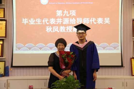 为深入开展好以“感恩母校”为主题的教育活动,鼓励毕业生充分合理表达对母校的感恩之心和祝福之情,引导毕业生珍惜师生之情、同学之谊,感激社会的关爱、母校的培养、导师的教诲、同学的帮助,典礼现场还专门设计了两项献花环节。毕业生代表井源同学心怀不舍地给导师代表吴秋凤教授献花。