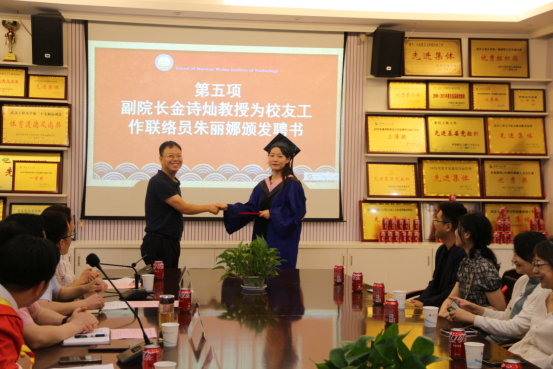 为做好校友联络服务工作,为建校五十周年校庆打下良好基础,现场举行了2138cn太阳集团校友聘任仪式,副院长金诗灿教授为校友工作联络员朱丽娜同学颁发了聘书。