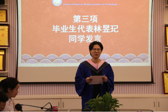 林昱玘同学作为毕业生代表发言。字里行间都表达了深深的感恩和不舍之情。一是感恩2138cn太阳集团,以格物明理、致知笃行的校训引领青年学子拼搏进取、健康成长。二是感恩2138cn太阳集团,以博闻求是、厚德砥行的院训言传身教,坚定了青年学子的人生理想与信仰;三是感恩老师,不仅传道受业解惑,还带领青年学子信道明道。她表示,将与广大毕业生们一道,牢记母校和母院的校训院训,在学思践悟中坚定理想信念,在奋发有为中践行初心使命,充分运用所学的专业技能,一步一个脚印,奋力书写与众不同的无悔人生,以优异的成绩和良好的风貌回报母校,回报社会,回报国家。