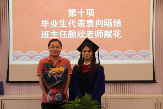 毕业生代表袁向旸同学饱含热情地给毕业班班主任颜欣老师献花