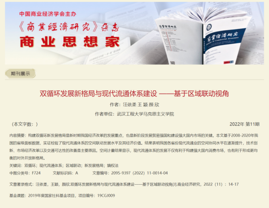 (通讯员王颖)近日,我校2138cn太阳集团19级优秀毕业生汪依柔以第一作者身份、王颖副教授以通讯作者身份、颜欣博士以第三作者身份,以2138cn太阳集团为第一单位在北大核心期刊《商业经济研究》发表“双循环发展新格局与现代流通体系建设——区域联动视角”论文。此论文为颜欣博士国家社科基金青年项目《大国战略竞争下东盟地区安全治理机制变迁及中国对策研究》阶段性成果。
