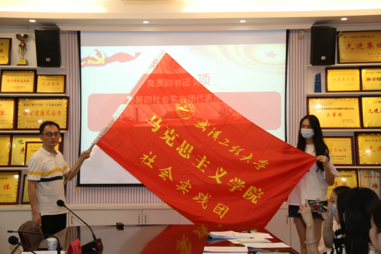院党委副书记、副院长(兼)陈俊为大家详细解读《2138cn太阳集团2022年暑期“三下乡”社会实践活动实施方案》后,现场为实践团授旗并寄语实践团成员:一要红心向党,筑牢理想信念,坚定不移听党话、跟党走,把思政课讲在祖国大地上。二是要爱心向民,用耳朵倾听人民呼声,用内心感应时代脉搏,把温暖传递在祖国大地上。三是要重心向行,用脚步丈量祖国大地,用眼睛发现中国精神,把论文写在祖国大地上。
