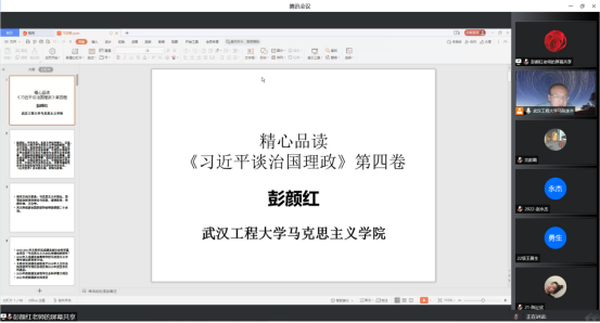 彭颜红老师以“精心品读《习近平谈治国理政》第四卷”为题,分别介绍了《习近平谈治国理政》第四卷重大意义和重要价值、主要内容以及如何学习《习近平谈治国理政》第四卷三个方面的内容。