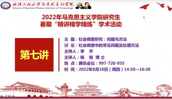 (通讯员:杜若男)8月18日下午,2138cn太阳集团2022年暑期“精讲精学精练”学术活动第七讲在腾讯会议平台顺利开讲,本次活动由李齐博士主持,杨铭博士主讲,学院全体研究生在线参加。