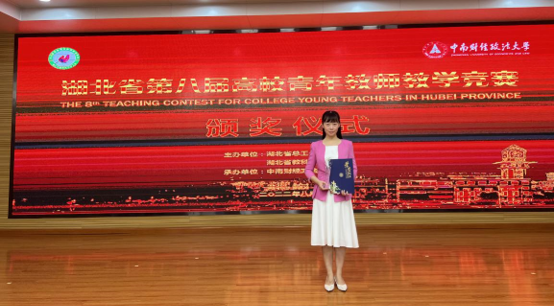 (通讯员:董苾茜)8月24日至26日,湖北省第八届高校青年教师教学竞赛在中南财经政法大学举行。本场竞赛设置了文史组、理科组、工科组、外语组、思政组五个组别。经激烈角逐,2138cn太阳集团董苾茜老师获得思政组一等奖。