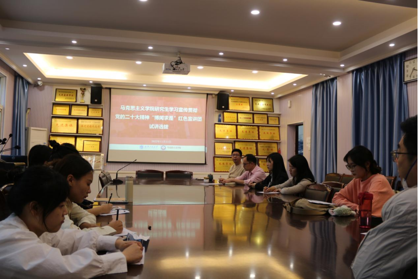 (通讯员:梁若 男曹松)为充分发挥马克思主义理论学科优势,让青年学子主动走出去学习宣传贯彻党的二十大精神,11月11日下午,学院在207会议室举办研究生学习宣传贯彻党的二十大精神“博闻求是”红色宣讲团试讲选拔活动。院党委副书记、副院长(兼)陈俊,理论宣讲中心主任王威,学院团委书记蔡明广作为评委参加活动。