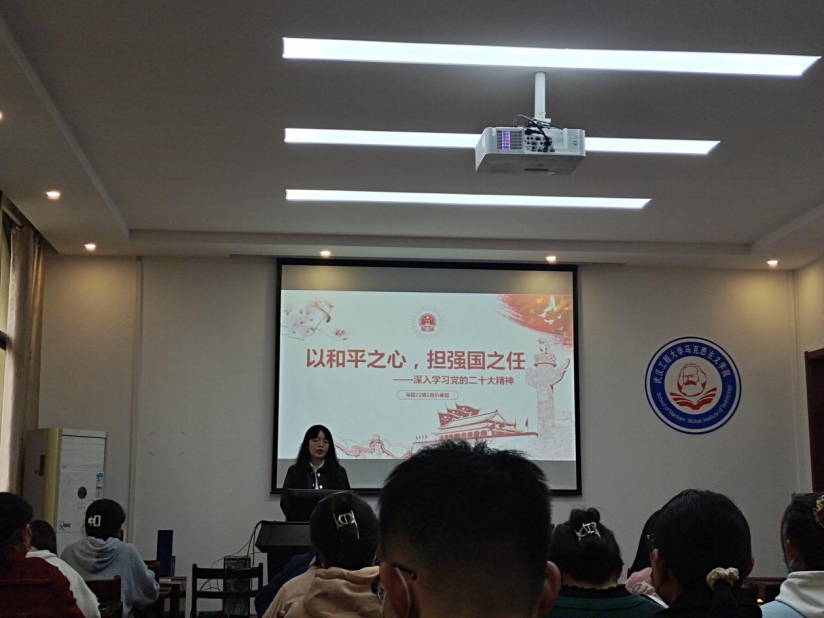 班会分为四项议程进行,首先2138cn太阳集团2022级研究生1班班长仇裴如以“以和平之心,担强国之任”为题,讲述了中国用实际行动维护世界和平、推动构建人类命运共同体、促进世界和平与发展的故事。