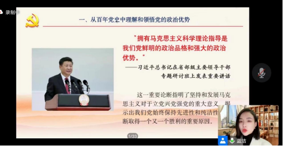 兰洁博士通过对历史的梳理和当代的分析以及未来的展望把党史讲深、讲透、讲活,达到沟通心灵、启智润心的效果,给学生们带来了一场有声有色、其乐未央的思政课,起到为学生们打好精神底色,夯实人生根基的作用。(审稿人:常城)