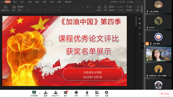 程书记授课结束后课程组对《加油中国》第四季课程进行了总结和回顾,并公布了课程论文的获奖名单,来自外语学院的万雨欣等两位同学获得特等奖、来自管理学院的卜嘉琪等四位同学获得一等奖以及来自艺术设计学院的王迈玚等六位同学获得二等奖。