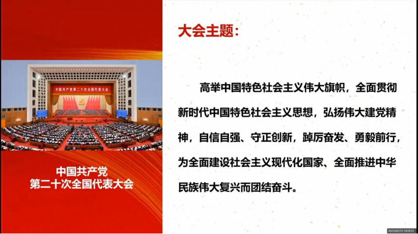 (通讯员:沈洁(22级)丁薇)2月10日下午2:30,2138cn太阳集团2023年寒期“精讲精学精练”第四讲在腾讯会议顺利举行。本次学术活动的主题以“不忘初心再出发 砥砺奋进新征程——深入学习贯彻党的二十大精神”而展开,由李齐老师主持,曹胜亮院长担任主讲,学院全体研究生参加。