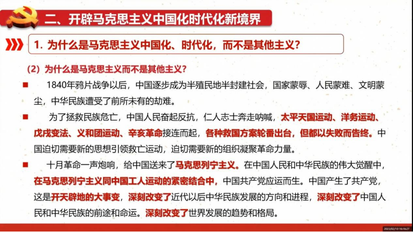 在解读党的二十大报告精神时,曹院长围绕“以中国式现代化全面推进中华民族伟大复兴”为主线,为同学们讲解了党的二十大精神的本质内涵和知识框架,简明扼要地阐述了其核心要义,描述了党的十八大以来新时代十多年的伟大变革,重点论述了开辟马克思主义中国化时代新境界的内在逻辑,包括为什么是马克思主义中国化、时代化,而不是其他主义?为什么要开辟马克思主义中国化、时代化新境界?怎样开辟新境界?如何评价新境界?新境界在实践中如何表达等五个方面。