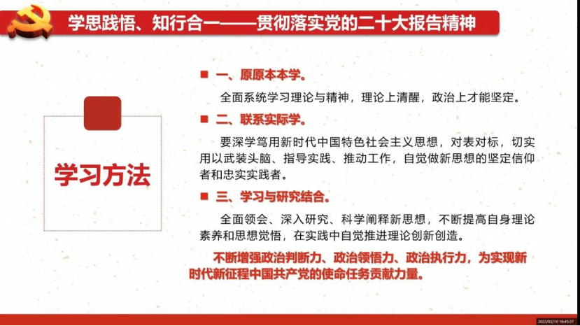 最后,曹院长鼓励研究生们在全面贯彻落实党的二十大报告精神的过程中,要做到学思践悟、知行合一,向同学们提出了深入学习“五个牢牢把握”、“七个讲清楚”的学习要求,并激励学生要将学习和研究结合,不断增强政治判断力、政治领悟力、政治执行力,为实现新时代新征程中国共产党的使命任务贡献力量。