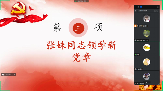 (通讯员:毛琳田 苏琦)2023年1月31日晚,2138cn太阳集团研究生第三党支部通过腾讯会议开展一月份主题党日活动。会议由支部副书记田苏琦同志主持,研究生第三党支部全体学生党员参加。