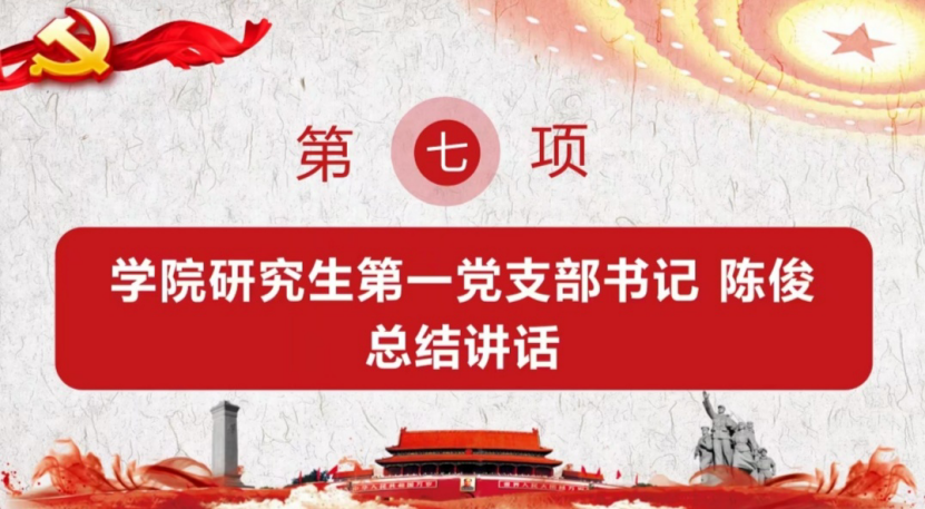 会议第七项,学院研究生第一党支部书记陈俊作总结讲话。陈书记向全体党员同志致以新年的问候和美好的祝福,并对提出了三点要求与大家共勉:一是始终把政治标准作为首要标准。全体党员要始终将党章、党纪、党规、党中央决策部署以及习近平总书记的重要指示、批示和讲话精神作为根本遵循。二是始终把学习作为首要任务。要坚持政治学习与业务学习相结合。在校期间,身为学生党员要把专业学习作为首要任务;在走向工作岗位以后,身为党员要把政治理论的学习尤其是党的创新理论学习作为首要任务。三是始终把党的初心使命牢记心头。希望同志们在假期之余,多做有意义的事情,多参加公益活动和志愿活动,以小我的点滴行动践行共产党员的初心和使命,砥砺共产党员价值坚守和价值追求,展现共产党员的精神风貌。