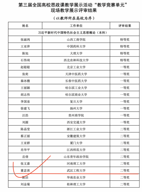 学校领导高度重视思政课教学展示活动,教师发展中心和马院对参赛选手给予了全方位支持!2023年9月,我校教师董苾茜参加了湖北省第二届高校思想政治理论课教学展示活动,通过参赛材料盲评及现场展示,取得“习近平新时代中国特色社会主义思想概论”组特等奖,并获得入围国赛资格。经历了教育部组织的形式审查,以及学情分析报告、创新教案、创新课件、说课视频的筛选,董苾茜得以入围最终现场教学展示环节。
