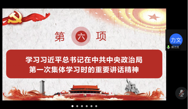 接着,郑力文同志领学了习近平总书记在中共中央政治局第一次集体学习时的重要讲话精神,她提到习近平总书记强调全党要在全面学习、全面把握、全面落实上下功夫,坚定不移把党的二十大提出的目标任务落到实处,奋力夺取全面建设社会主义现代化国家新胜利。