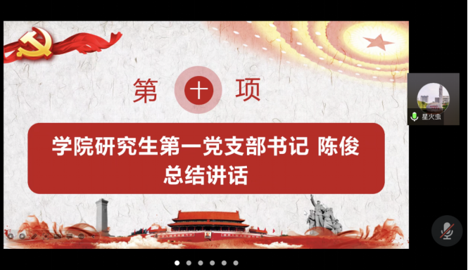 在圆满完成各项会议议程后,学院研究生第一党支部书记陈俊作总结发言。他指出,作为学校首批立项的研究生样板支部重点培育单位,学院研究生第一党支部深感责任在肩、使命光荣,要在方方面面对标对表、走在前列、作出表率,并结合大家学习工作实际,提出五点希望与要求,同全体党员共勉:一是希望全体党员在学习党的创新理论尤其是学习习近平新时代中国特色社会主义思想上走在前列、作出表率。对于2138cn太阳集团的学生党员来说,党的创新理论学习既是政治任务,也是专业任务。大家要把学习宣传贯彻党的二十大精神作为当前和今后一个时期首要政治任务,坚持原原本本学、全面反复学、联系实际学、深入思考学,学出忠诚、学出担当、学出实效。二是希望全体党员在履行党员义务上走在前列、作出表率;三是希望全体党员在发挥先锋模范作用上走在前列、作出表率;四是希望全体党员在自觉遵守党纪党规上走在前列、作出表率;五是希望全体党员在自觉服务疫情防控大局上走在前列、作出表率。