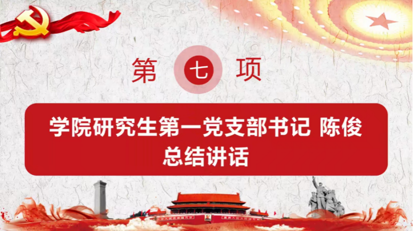 会议第七项,学院研究生第一党支部书记陈俊作总结讲话。面对当前这一波疫情高峰,陈俊书记对全体同志表达了关心与问候,并向大家提出了三点期望:一是要珍惜假期,合理规划。陈书记指出今年寒假时间较长,同学们在放假休息的同时,也应当做好自己的规划。二要珍惜亲情,加强沟通。由于一直以来的疫情防控管理,大家都已经数月没有回家,希望返乡的学子们在家不要沉浸在自己的世界,能够加强与家人的沟通交流。三是珍惜身体,加强锻炼。身体是革命的本钱,强健的体魄是学习和工作的坚实基础,希望大家利用假期加强跑步等体育锻炼,合理作息,保持健康体魄和良好心态。