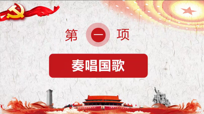 会议第一项,全体起立,奏唱国歌。