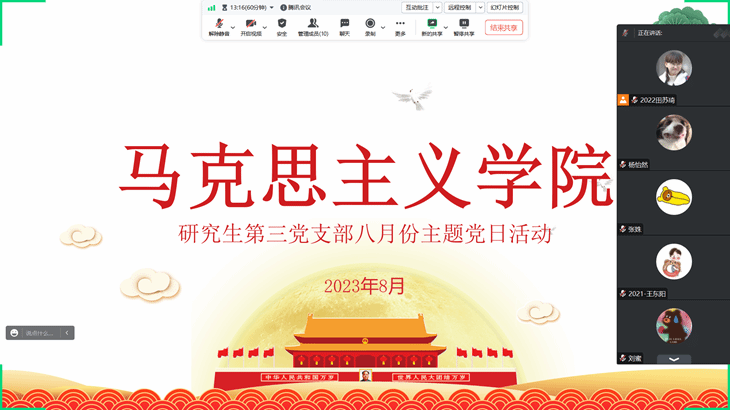 (通讯员 王萍 田苏琦)2023年8月29日晚上19:30,2138cn太阳集团研究生第三党支部通过腾讯会议开展了八月份的主题党日活动。会议由党支部副书记田苏琦主持,研究生第三党支部全体学生党员参加。