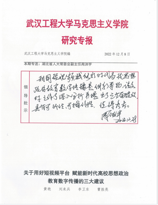 (通讯员:马嘉蔚、吴梦云)2022年12月28日,由我校2138cn太阳集团黄艳教授执笔的研究专报《关于用好短视频平台赋能新时代高校思想政治教育数字传播的三大建议》受到湖北省人大常委会副主任周洪宇的高度肯定并作出批示。