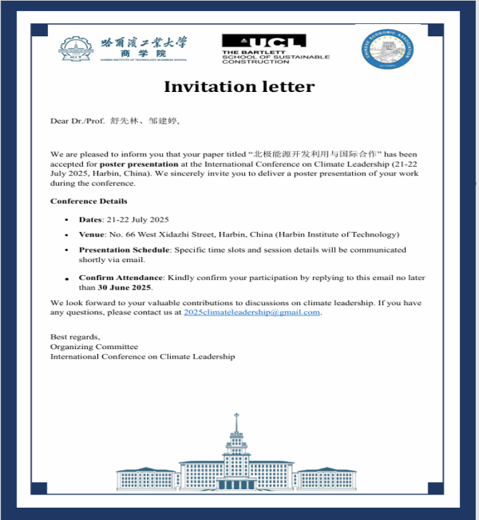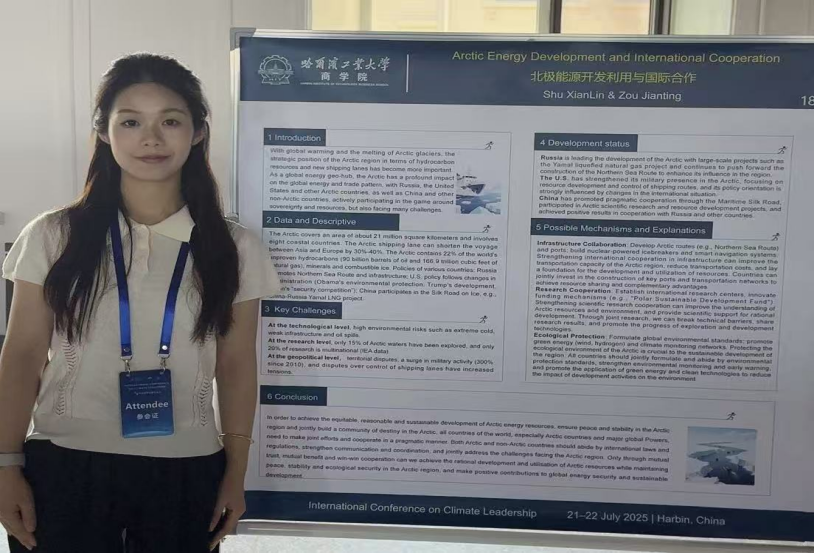 邹建婷同学代表受邀方参加此次国际会议并以海报形式分享了论文研究主题。该论文以北极地区能源利用和航道开发为视角,阐述了北极在全球能源和贸易格局中战略定位和深远影响,分析了以俄罗斯、美国为代表的北极国家和以中国为代表的非北极国家积极参与北极事务,以及对北极能源等资源和新航线开发主导权所展开的多轮博弈,指出北极能源开发与国际合作面临资源勘探不足、开发难度大、地缘复杂等现实挑战,并提出了实现北极资源可持续开发、构建北极命运共同体的对策建议。
